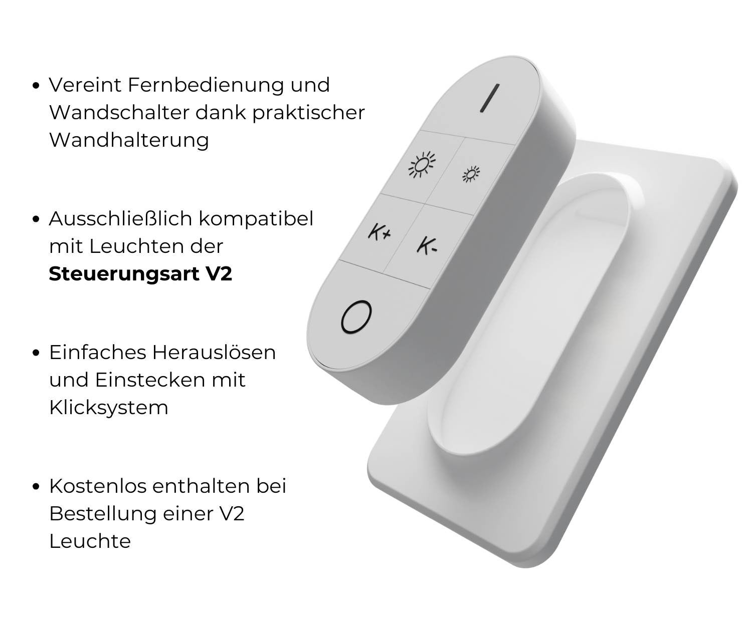 Met trots presenteren we onze nieuwe V2-lampen , die naast smarthome-integratie beschikken over nog warmere leds (2200 K) en verbeterde componenten, en worden geleverd met een innovatieve afstandsbediening. Dankzij de wandhouder zijn de afstandsbediening en de wandschakelaar intelligent gecombineerd.
